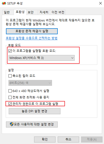 호환 모드를 Windows XP SP3으로 변경해주고, 관리자 권한으로 실행에 체크합니다