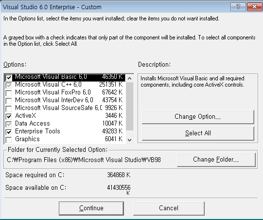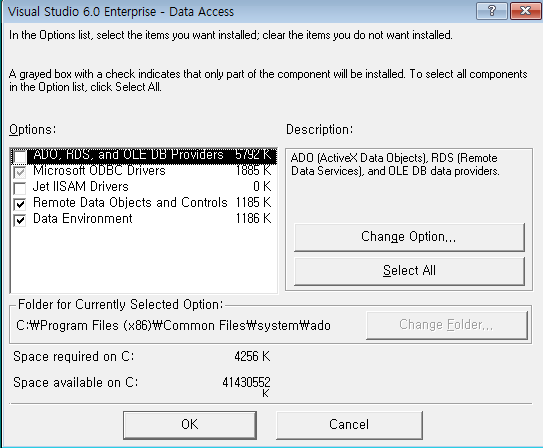 Visual FoxPro, InterDev, SourceSafe는 필요가 없으니 체크 해제 하고, Data Access를 클릭한 후 오른쪽 화면의 Change Option...을 클릭합니다.