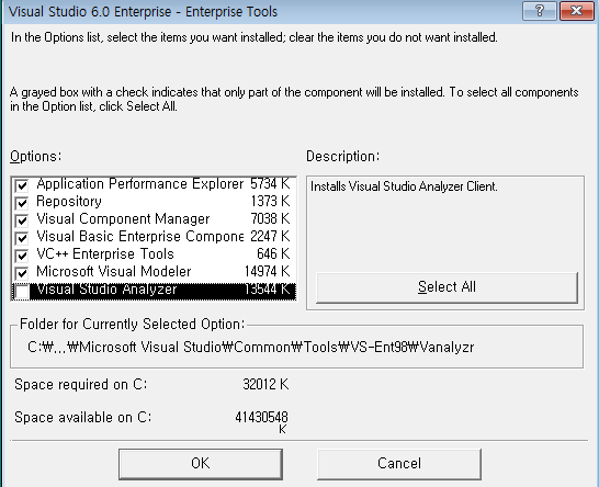 다시 Enterprise Tools를 체크하고 Change Option..를 클릭 후, 하단의 Visual Studio Analyzer를 체크해제 합니다.