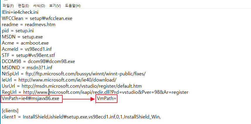 설치 파일 중, SETUPWIZ.INI 내 VmPath 의 내용을 삭제합니다.
